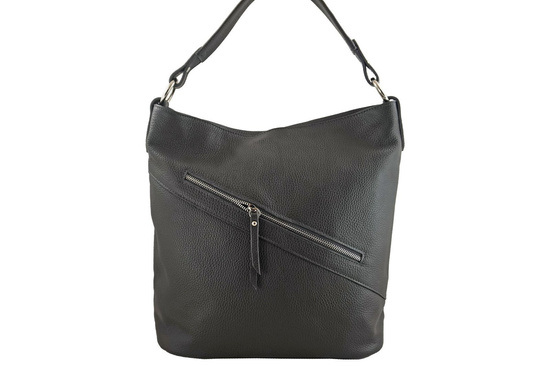 Wnętrze worka: w komorze głównej, wykończonej podszewką, znajduje się mniejsza zasuwana kieszonka oraz dwie kieszenie otwarte mieszczące telefon, portfel lub mały notes. Na zewnątrz, z tyłu, znajduje się poręczna zasuwana kieszeń ułatwiająca szybki dostęp np. do kluczy. Duży worek na ramię skórzany posiada zasuwaną kieszeń ukośną z przodu ozdobioną skórzanymi paseczkami, która wyróżnia ten model torebki. Wygodnej długości uchwyt bez regulacji (długość 44cm, wysokość 22cm) mocowany jest na dwóch metalowych kołach; pasek dodatkowy posiada regulację (maksymalna dł. 122cm, maksymalna wys. 68cm) i umożliwia noszenie worka na ramieniu lub wygodnie przewieszony przez ramię. Duży worek na ramię skórzany mieszczący format A4 posiada srebrne okucia i jest zasuwany.