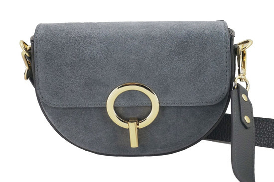 Wnętrze listonoszki: jednokomorowe wnętrze jest wykończone podszewką. Wewnątrz wyodrębniono zasuwaną kieszeń mieszczącą kosmetyki, klucze lub mały notes. Modna torebka wizytowa skórzana jest zapinana ozdobnym zapięciem, posiada złote okucia, wygony szeroki pasek bez regulacji (długość 105cm, wysokość 50cm, szerokość paska 3cm). Na zewnątrz, z tyłu, znajduje się zasuwana ozdobnie doszyta kieszeń. Łączenie skóry naturalnej licowej ze skórą naturalną zamszową wyróżnia ten model listonoszki dostępnej w kolekcji torebek skórzanych dostępnych w sklepie.