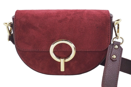 Wnętrze listonoszki: jednokomorowe wnętrze jest wykończone podszewką. Wewnątrz wyodrębniono zasuwaną kieszeń mieszczącą kosmetyki, klucze lub mały notes. Modna torebka wizytowa skórzana jest zapinana ozdobnym zapięciem, posiada złote okucia, wygony szeroki pasek bez regulacji (długość 105cm, wysokość 50cm, szerokość paska 3cm). Na zewnątrz, z tyłu, znajduje się zasuwana ozdobnie doszyta kieszeń. Łączenie skóry naturalnej licowej ze skórą naturalną zamszową wyróżnia ten model listonoszki dostępnej w kolekcji torebek skórzanych dostępnych w sklepie.