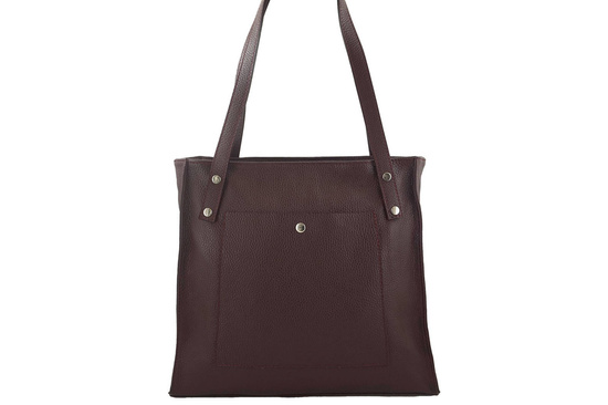 Wnętrze torebki: przestronne wnętrze jest wykończone podszewką. Wewnątrz wyodrębniono małą zasuwaną kieszonkę mieszczącą drobne kosmetyki oraz miejsce na telefon. Torebka skórzana na ramię mieści format A4, jest zasuwana, posiada uchwyty bez regulacji ozdobione srebrnymi nitami (długość 60cm, wysokość 26cm), pojemną kieszeń z przodu oraz zasuwaną kieszonkę z tyłu, umożliwiającą szybki dostęp np. do kluczy. Codzienna torebka skórzana na ramię dostępna w szerokiej palecie kolorów.