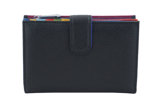 Wnętrze portfela: wielokolorowe wnętrze portfela, zapinane na zatrzask, posiada osiem miejsc na karty płatnicze lub lojalnościowe, dwa miejsca na dokument ze zdjęciem lub fotografię najbliższych, kieszeń schowek na paragony lub listę zakupów oraz dwie przegrody na banknoty. W części zasuwanej znajdują się dwie przegrody na bilon. Najważniejszym atutem tego modelu jest zabezpieczenie przed kradzieżą z kart płatniczych. Specjalna wkładka uniemożliwia odczyt karty. Portfele skórzane z ochroną kart RFID dostępne w najnowszej kolekcji Dla Pań spełnią oczekiwania pod względem jakości wykonania, z dbałością o szczegóły.