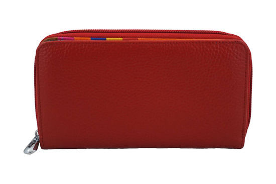 Wnętrze portfela: wielokolorowe wnętrze portfela, zapinane na zatrzask, posiada dziewięć miejsc na karty płatnicze, miejsce na dokument ze zdjęciem, cztery kieszenie na paragony, listę zakupów lub bilety oraz dużą przegrodę na banknoty. W części zasuwanej znajdują się dwie przegrody na banknoty, środkowa kieszeń zasuwana miesząca bilon oraz sześć miejsc na karty lub wizytówki. Antykradzieżowy portfel z ochroną RFID dostępny w najnowszej kolekcji Dla Pań będzie idealny rozmiarowo w torebkach klasycznych, plecakach, workach lub większych listonoszkach.