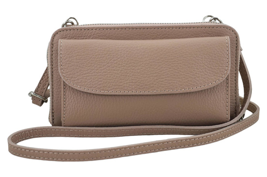 Wnętrze portfela/etui: portfel z etui na telefon ze skóry licowej posiada dwie odrębne strefy. W części na suwak znajduje się zasuwana kieszonka na monety, przegrody na banknoty oraz osiem miejsc na karty płatnicze, lojalnościowe, dowód osobisty i prawo jazdy. Portfel z etui na telefon ze skóry licowej posiada srebrne okucia, dużą kieszeń z przodu zamykaną na zatrzask (wymiary kieszeni: wysokość 9cm, szerokość 17cm, głębokość 1,8cm) oraz doczepiany i regulowany pasek (maksymalna dł. 121cm, maksymalna wys. 63cm). Ofertę kierujemy do kobiet, dla których wygoda jest podstawowym kryterium w wyborze praktycznych rozwiązań do przechowywania dokumentów oraz telefonu, idealnych na zakupy, spacer lub np. jazdę na rowerze. Wygodny i praktyczny portfel z etui na telefon ze skóry licowej nie krepuje ruchów przewieszony przez ramię, jednocześnie będzie gustownym dodatkiem stroju zarówno casualowego jak i sportowego.