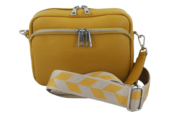 Torebka damska z ozdobnym paskiem żółta ciemna została wykonana ze skóry naturalnej licowej. Klasyczny fason urozmaicony kolorowym paskiem, pojemną zasuwaną kieszenią z przodu oraz solidne wykonanie wyróżnia ten model listonoszki, która podkreśli stylizacje zarówno swobodne casual, jak i te na wyjątkowe okazje. Torebka damska z ozdobnym paskiem spełni oczekiwania naszych Klientek pod względem jakości produktu oraz uniwersalnego fasonu torebki, która sprawdzi się jako dodatek codziennej garderoby. Zapoznaj się z naszą najnowszą ofertą torebek skórzanych - listonoszek, klasycznych lub wygodnych plecaków. Oferujemy duży wybór produktów galanterii skórzanej Dla Niej i Dla Niego.