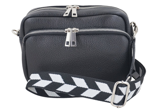 Torebka damska z ozdobnym paskiem czarna została wykonana ze skóry naturalnej licowej. Klasyczny fason urozmaicony kolorowym paskiem, pojemną zasuwaną kieszenią z przodu oraz solidne wykonanie wyróżnia ten model listonoszki, która podkreśli stylizacje zarówno swobodne casual, jak i te na wyjątkowe okazje. Torebka damska z ozdobnym paskiem spełni oczekiwania naszych Klientek pod względem jakości produktu oraz uniwersalnego fasonu torebki, która sprawdzi się jako dodatek codziennej garderoby. Zapoznaj się z naszą najnowszą ofertą torebek skórzanych - listonoszek, klasycznych lub wygodnych plecaków. Oferujemy duży wybór produktów galanterii skórzanej Dla Niej i Dla Niego.