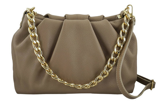 Marszczona torebka z łańcuszkiem beżowa została wykonana z naturalnej skóry licowej. Eleganckie stylizacje uzupełnią torebki dostępne w naszym sklepie - duży wybór kolorów, najnowsze trendy, ciekawe łączenie różnego rodzaju skór naturalnych oraz delikatne ozdoby. Modna marszczona torebka z łańcuszkiem w beżowym kolorze to idealny dodatek garderoby - dopasujesz ją do sukienek lub eleganckich spodni. Uniwersalny fason, rozmiarowo idealny aby pomieścić niezbędne rzeczy - telefon, portfel oraz drobne kosmetyki. Wyróżniający ten model złoty łańcuszek, marszczenie po obu stronach oraz wysokiej jakości skóra naturalna gwarantują iż torebka będzie idealnym uzupełnieniem stylizacji na wyjątkową okazję. Chcesz być informowana o nowej kolekcji, uzupełnieniu magazynowym lub aktualnych promocjach? Zapisz się do naszego newslettera - wraz z informacją o najnowszej kolekcji otrzymasz rabat -15% na zakupy. Skorzystaj z oferty naszego sklepu - gwarantujemy wysoką jakość produktów, solidne wykonanie oraz duży wybór modeli torebek oraz portfeli.