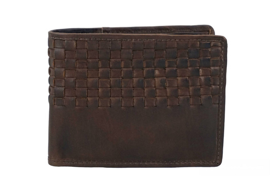 Wnętrze portfela: dostępny w najnowszej kolekcji stylowy portfel męski skórzany nie posiada zapięcia. Ten model wyróżnia pleciony wzór w górnej części portfela. Wewnątrz znajduje się miejsce na dowód osobisty i kartę płatniczą oraz kieszonka na zatrzask mieszcząca monety. Pośrodku znajduje się suwak do dużej i szerokiej kieszeni; dodatkowo pod kieszonką na bilon znajduje się ukryta kieszeń / schowek. W części zapinanej na zatrzask wyodrębniono dwa duże miejsca na dokumenty oraz zdjęcia, sześć miejsc na karty płatnicze oraz dwie przegrody na banknoty, listy zakupów lub bilety; również w tej części portfela znajduje się mała kieszeń / schowek. Stylowy portfel męski skórzany jest dostępny w trzech klasycznych kolorach: czarny, brązowy oraz brązowy ciemny. Sprawdź szeroką ofertę portfeli wykonanych z dbałością o szczegóły, z wysokiej jakości skóry naturalnej.