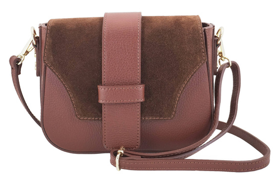 Torebka listonoszka z zamszową klapą w kolorze brązowym jest wykonana ze skóry naturalnej licowej w połączeniu ze skórą naturalną zamszową. Idealna propozycja wśród torebek na każdy dzień - klasyczna torebka urozmaicona ozdobnie wyciętą klapką, z długim regulowanym paskiem umożliwia noszenie torebki na ramieniu lub wygodnie przewieszonej przez ramię. W naszym asortymencie czekają na Ciebie skórzane torebki typu “listonoszka”, które dopasujesz zarówno do okazji, jak i Twojego stylu. Oferowane w najnowszej kolekcji torebki zaprojektowano tak, aby mieściły portfel, telefon, klucze oraz drobne kosmetyki. Torebka listonoszka z zamszową klapą to propozycja dla Pań ceniących gustowne dodatki codziennej garderoby, zwracających uwagę na jakość i estetykę wykonania produktu ze skóry naturalnej. Zachęcamy do zapoznania się ze szczegółową ofertą klasycznych torebek damskich skórzanych. Oferujemy również duży wybór portfeli ze skóry lakierowanej lub z kolorowym wnętrzem, zapakowanych w ozdobne, dopasowane pudełko.