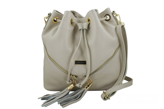 Torebka damska - worek z frędzlami w kolorze jasnego beżu została wykonana ze skóry licowej. Wygodne i pojemne worki skórzane to doskonała propozycja dla kobiet ceniących modny design oraz funkcjonalność. W naszym sklepie znajdziesz szeroki wybór torebek ze skóry naturalnej, które łączą w sobie elegancję oraz wygodę użytkowania, idealnie sprawdzą się na co dzień - mieszczą to co niezbędne do pracy, na zakupy lub krótki weekendowy wyjazd. Torebka damska - worek z frędzlami wyróżnia się ukośnymi złotymi suwakami oraz zapięciem typu "troczek", co nada Twojej stylizacji niezwykłej lekkości i ciekawego charakteru.