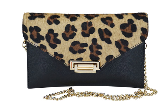 Kopertówka damska z motywem panterki w kolorze czarnym została wykonana z naturalnej skóry licowej. Wyjątkowa kopertówka damska z motywem panterki, marki Barberini’s, to idealne połączenie ponadczasowej elegancji i nowoczesnego stylu. Ten model został zaprojektowany z myślą o kobietach, które cenią jakość, detal i modny design. Torebka doskonale uzupełni zarówno wieczorową, jak i wizytową stylizację – doda charakteru małej czarnej, ale też świetnie zaprezentuje się w połączeniu z eleganckim garniturem czy stylową sukienką. Górna część kopertówki została wykonana z naturalnej skóry z wyrazistym printem w panterkę, który w subtelny sposób przyciąga wzrok i dodaje torebce drapieżnego uroku. Dolna część torebki utrzymana jest w klasycznej czerni z delikatną fakturą skóry, co tworzy efektowne i eleganckie połączenie kolorów oraz faktur.