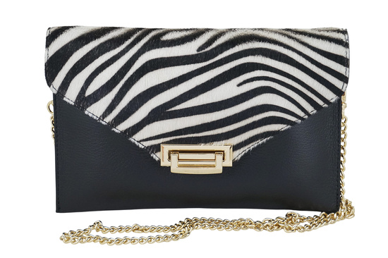 Elegancka kopertówka z modnym printem w kolorze czarnym została wykonana z naturalnej skóry licowej. Wyjątkowa kolekcja torebek ze skóry naturalnej licowej na specjalne okazje - elegancka kopertówka z modnym printem to idealne połączenie klasy i nowoczesnego stylu. Górna część kopertówki została wykonana z naturalnej skóry z wyrazistym printem, który w subtelny sposób przyciąga wzrok i dodaje torebce drapieżnego uroku. Dolna część torebki utrzymana jest w klasycznej czerni z delikatną fakturą skóry, co tworzy efektowne i eleganckie połączenie kolorów oraz faktur. Wyjątkowa torebka na złotym dopinanym łańcuszku doskonale sprawdzi się jako wieczorowy lub wizytowy dodatek garderoby – będzie idealna do eleganckich stylizacji, uroczystości i wyjątkowych okazji.