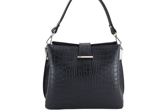 Nasza klasyczna torebka z włoskiej naturalnej skóry licowej w kolorze czarnym to symbol elegancji, który doskonale pasuje do każdej okazji. Cechuje się niezwykłą trwałością i wyjątkowym komfortem noszenia. Jej ponadczasowy design sprawia, że możesz ją zestawić zarówno z eleganckim garniturem na spotkanie biznesowe, jak i z casualowym outfitem na co dzień. Przemyślana konstrukcja wnętrza pozwala na sprawną organizację Twoich osobistych rzeczy, zapewniając jednocześnie stylowy wygląd. Ta torebka z tłoczeniem croco to nie tylko praktyczne akcesorium, ale także wyraz Twojego wyjątkowego gustu i klasy!