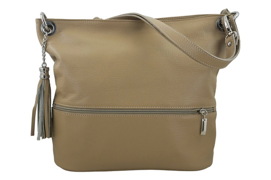 Wnętrze torebki: skórzane torebki włoskie wykończone są podszewką. Wewnątrz znajdują się dwie kieszenie - jedna zasuwana mieszcząca drobne kosmetyki oraz kieszeń na telefon. Na zewnątrz znajdują się dwie zasuwane kieszenie. Torebka posiada srebrne okucia oraz regulowany pasek. Może być noszona na pojedynczym lub podwójnym pasku, w zależności od sposobu zapięcia. Skórzane torebki włoskie wyróżnia ozdobny skórzany frędzelek na srebrnym łańcuszku.