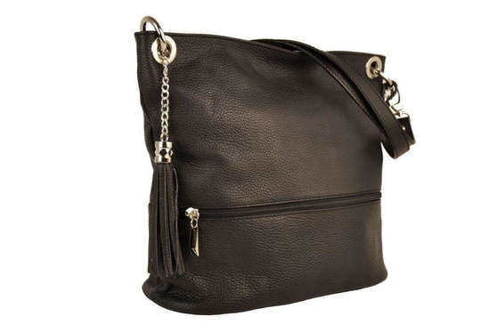 Wnętrze torebki: skórzane torebki włoskie wykończone są podszewką. Wewnątrz znajdują się dwie kieszenie - jedna zasuwana mieszcząca drobne kosmetyki oraz kieszeń na telefon. Na zewnątrz znajdują się dwie zasuwane kieszenie. Torebka posiada srebrne okucia oraz regulowany pasek. Może być noszona na pojedynczym lub podwójnym pasku, w zależności od sposobu zapięcia. Skórzane torebki włoskie wyróżnia ozdobny skórzany frędzelek na srebrnym łańcuszku.